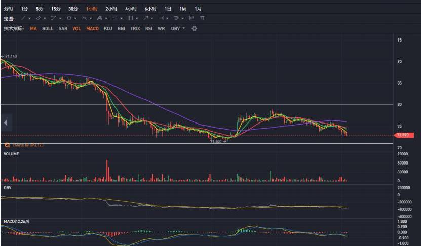 LTC自前日最高觸及77美元后震蕩下行,今日觸及今日低點72美元,短時多空勝負未分,聯動BTC為主。LTC/BTC交易對自昨日低點0.0070BTC附近小幅上行至0.0072BTC后有回落跡象,弱勢聯動BTC。