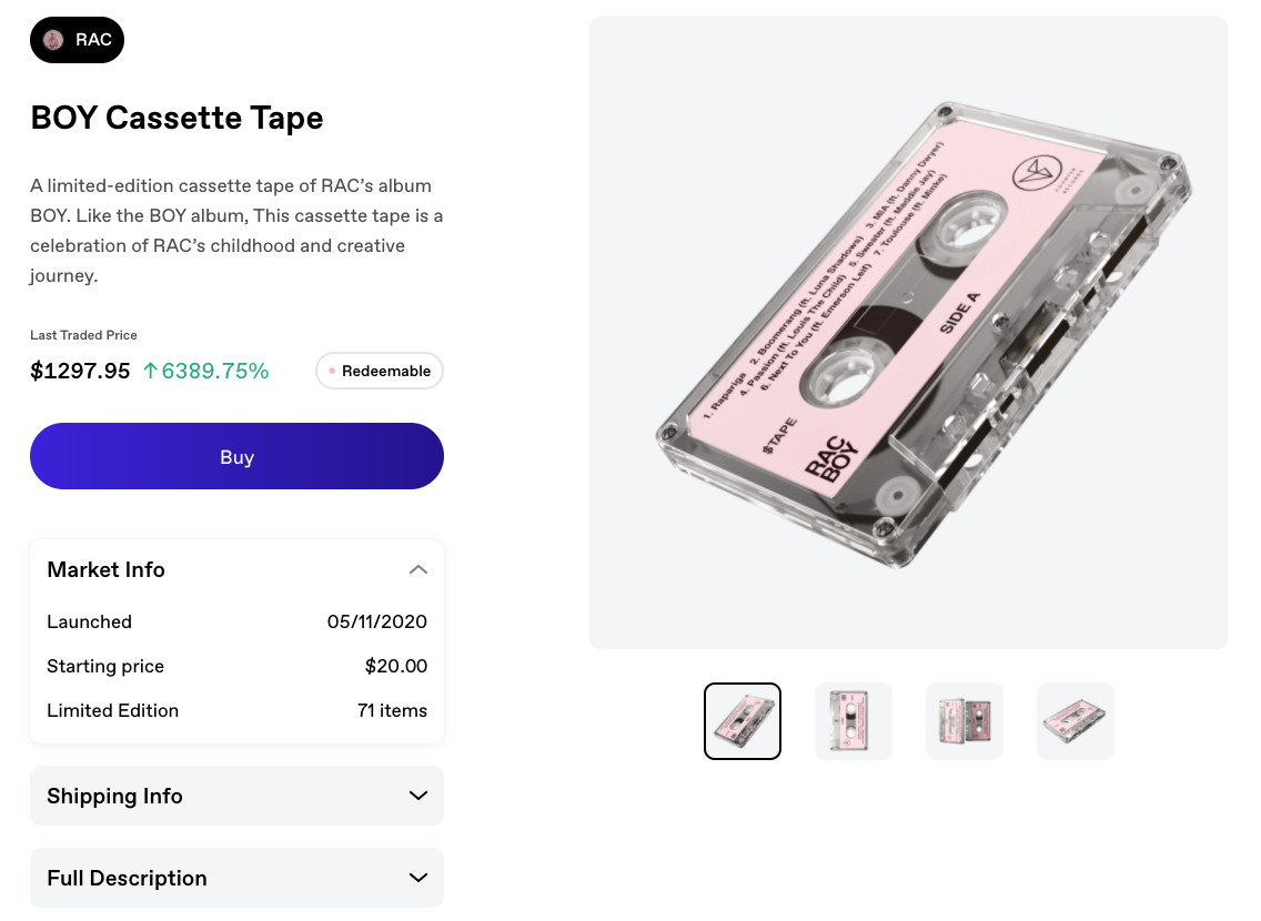 隨著數字藝術與數字收藏品市蓬勃發展之時,如果 NFT 也可以代表可創收的資產呢?比如說一首歌可以作為限量版 NFT 出售,并且還可以讓音樂人從二次銷售中獲利呢?格萊美獎獲得者 RAC 就使用 Zora 平臺發布了一張新專輯,并采用了這種模式。Zora 是一個可以交易限量版商品的市場,比如鞋子、唱片、藝術品,乃至任何東西。與之相關的代幣將與產品一起推出,甚至在商品存在之前就推出,這意味著商品可以根據供求關系進行動態定價。重要的是,隨著項目 NFT 的銷售,它可以讓項目方獲得等同于現實世界的銷售收入。例如,如果一雙 Yeezy 運動鞋在 Zora 上銷售,Kanye 和 Adidas 都能獲得一定份額的轉售價值。