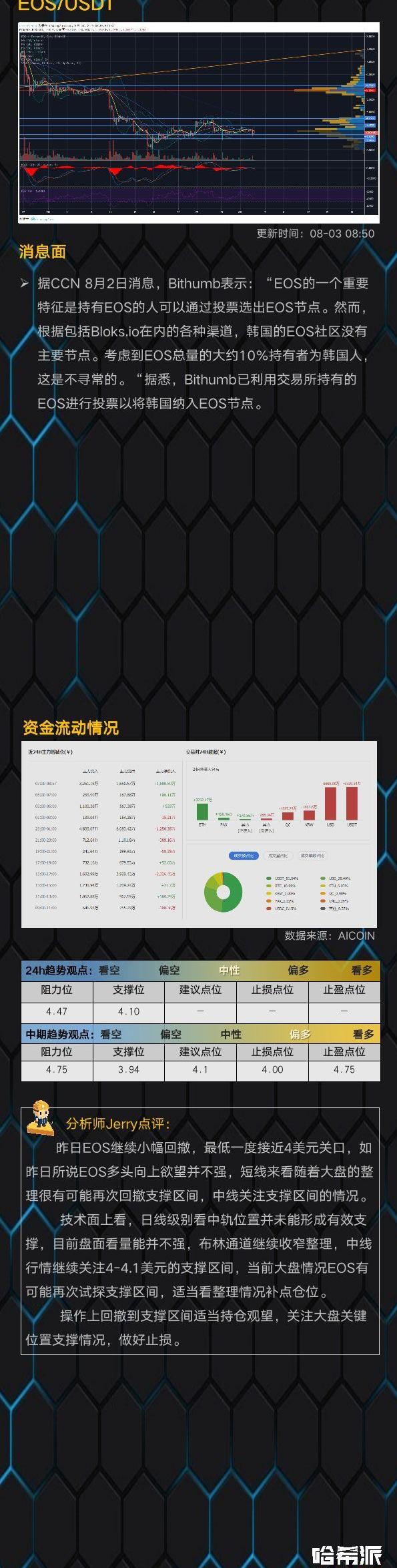 分析 | 大盤昨晚直線拉升后續怎么走?:金色財經分析師認為近期各主流幣在前日下破低點得到周線級別的重要支撐,昨日在平臺幣的帶動下開啟反彈大漲,日線反包形成,短期看漲,預計近日將逐步測試上方壓力位,若能突破大跌后的K線,則宣告調整結束,開啟新一輪趨勢行情,建議拿好手中中長線籌碼,短線可以適當低吸入場。BTC支撐3750/3700,壓力3890/3950;EOS支撐3.5/3.35,壓力3.85/4.35;ETH支撐133/129,壓力140/146;HT在1.62-1.42區間,其他品種同步BTC操作。