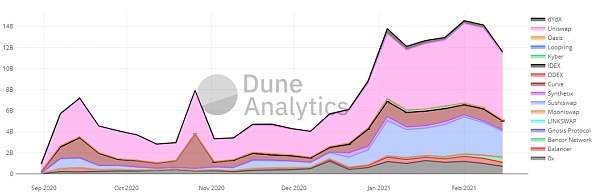 XRP/HKD-5.33%截止2月21日,DeFi協議總鎖倉量已達到接近630億美元的水平,DeFi一路走高,其重要領域——去中心化交易所(DEX)的競爭也分外激烈。Tokenlon、Matcha后來者雖勢頭強勁,Uniswap和SushiSwap兩大巨頭本身競爭亦更激烈,并且現穩居去中心化交易所前兩位,可謂是當之無愧的引領當前DeFi牛市走向新高的領頭羊。