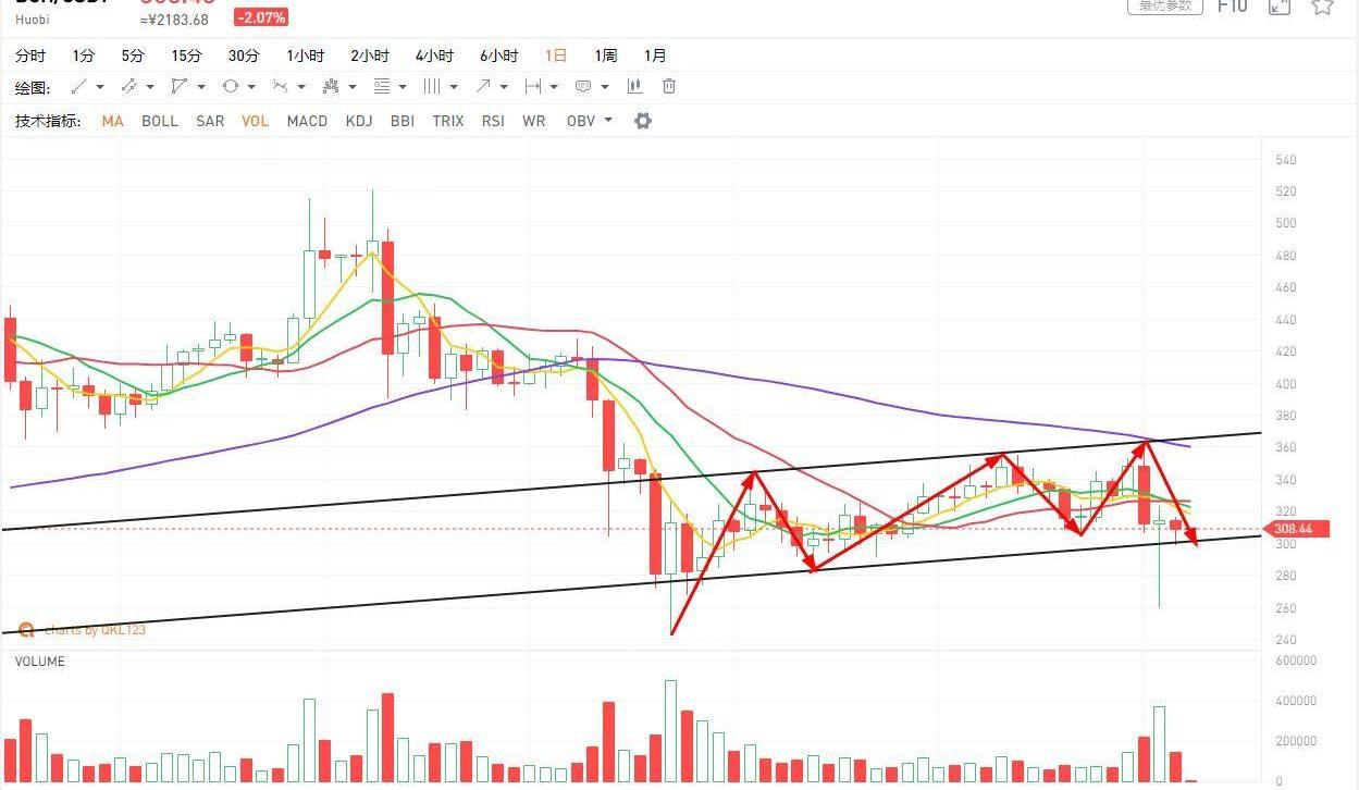 BCH還在通道內運行,尚未出現方向性的選擇,觀察未來幾天還會不會在跌破上升趨勢線,若不再跌破該上升趨勢線的話,可能會在次向上挑戰120天線,而且這次再上去我認為站上去的概率是比較大的,突破120天線或可挑戰前高的位置,若再次跌破上升趨勢線,應堅決離場。