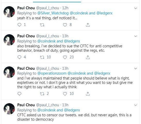 coindesk文章發出后,LedgerXCEOPaulChou隨后在推特評論稱CFTC此舉是“反競爭行為”、控訴CFTC違反規則、這種行徑完全背離民主原則等,還將對CFTC進行訴訟。同時,PaulChou表示已經和律師進行了洽談。