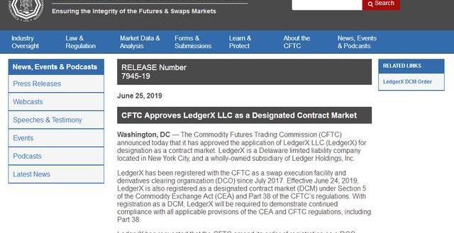 2019年6月25日,CFTC官網發布文件,宣布通過LedgerX的DCO申請。