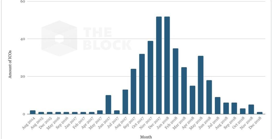 按照月份分類,ICO項目數量的分布與募資金額的分布非常相似。2017年12月和2018年1月的ICO項目數量最多。