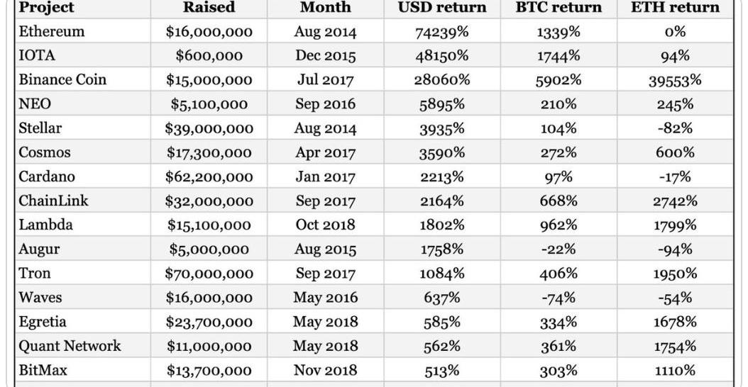 有11個項目的法幣回報率超過1000%。以太坊以74239%的美元收益率高居榜首,榜單中還有BNB、NEO、Cosmos等我們熟知的項目。