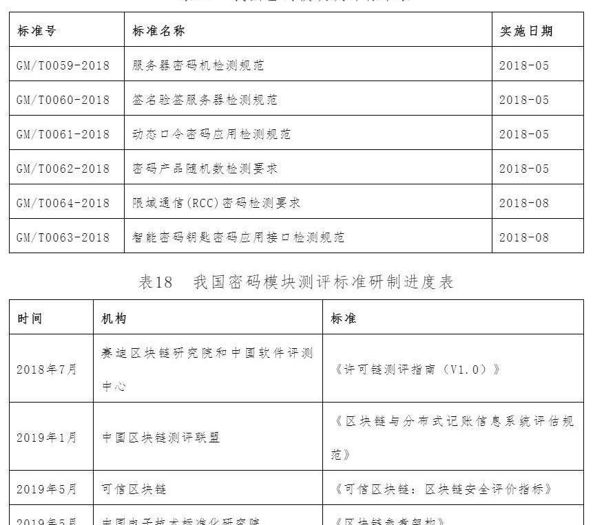 四是測評認證標準研究初見成果。測評認證標準能夠對區塊鏈產品質量和企業服務能力進行量化,促進企業產品質量和服務體系的改進,保證區塊鏈的性能和安全性,為用戶提供參考依據。目前國內企業和研究機構按照測評對象的不同主要有兩大類,一類是針對系統密碼模塊安全的測評標準,一類是區塊鏈底層平臺測評標準。