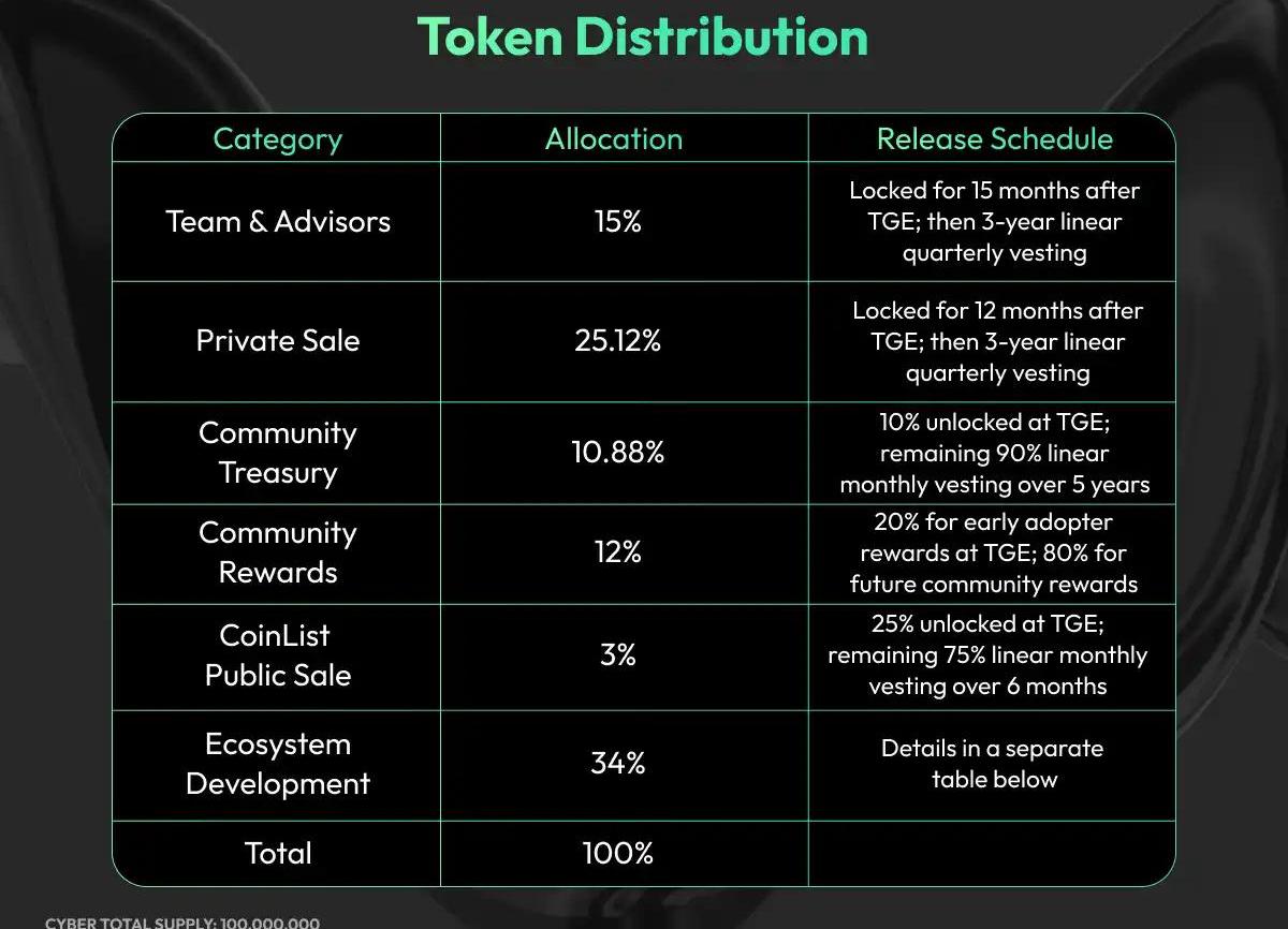 CYBER總供應量為100,000,000枚,CoinList公開發行量占3%,其中25%上線后解鎖,剩下75%在6個月內線性按月解鎖。詳細的分配如下: