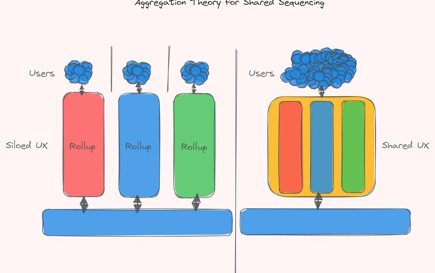 另一種描述共享排序器的特性的方法是通過聚合理論的視角。聚合理論(AT)是關于平臺或聚合器如何通過集成其他平臺及其用戶的系統方式獲得顯著用戶吸引力的概念。您基本上將游戲從分配稀缺資源更改為控制對豐富資源的需求。AT本質上是將供應商和產品聚合到聚合用戶群的單一卓越用戶體驗中。隨著這些聚合器網絡效應的增長,這種關系變得越來越排外——沒有理由離開。當這種情況發生時,用戶體驗就成為類似設置之間的重要區別因素。如果存在對新用戶的激勵,那么將rollup轉移到他們自己的網絡或不同集合的可能性就不太可能了——因為網絡效應會驅動新供應商和新用戶。這會產生飛輪效應,無論是從供應商和用戶的角度來看,還是從聚合審查抵制的角度來看。