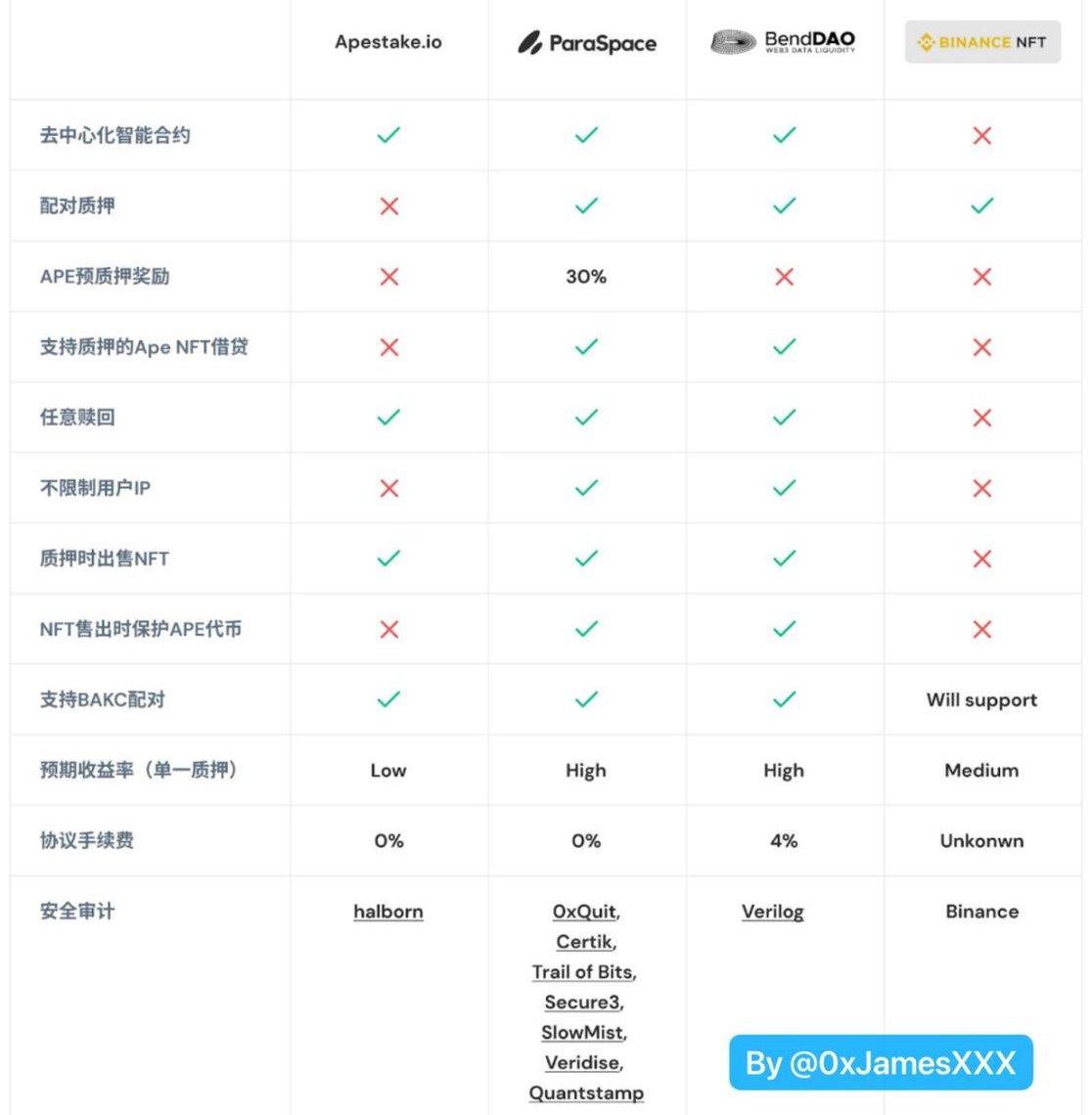 另外,ParaSpace的APE質押有自動領取及復利你所質押的APE的功能,相比起BendDAO,ParaSpace的複利功能將大大提高質押的收益,并替用戶省心。以下是@0xJamesXXX整理出來不同APE質押平臺的分別,供大家參考: