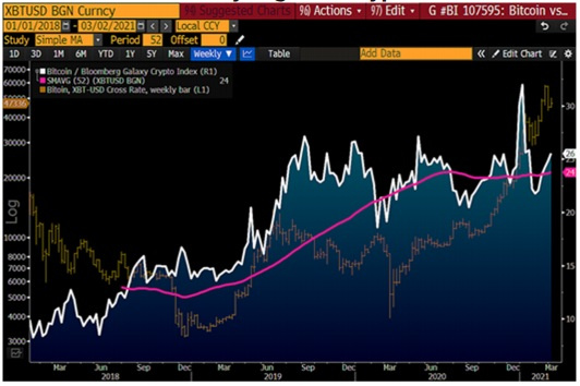 比特幣是第一個誕生的加密貨幣,這一獨特屬性正在推動其發展成為全球數字儲備資產,同時也將比特幣和其他 8,000 多種加密資產區分開來。從 Bloomberg Galaxy Crypto Index (BGCI) 指數趨勢圖表中可以看出,比特幣表現好過傳統市場,由于比特幣支持者越來越多,該指數可能會進一步升值。