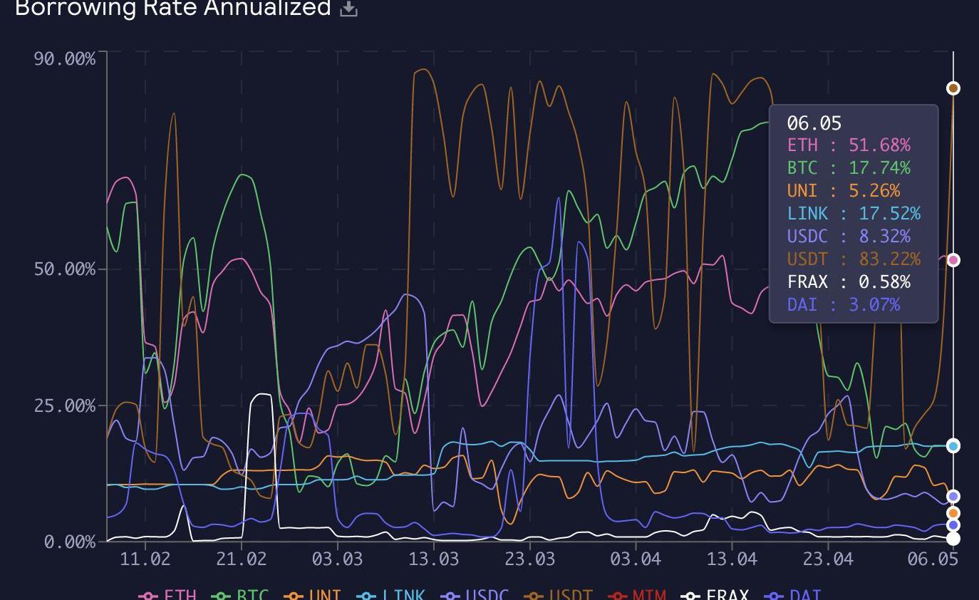 GMX完全根據資金的利用率,也就是已借資產/可借資產的比例進行計算。例如在5月6日以太坊基金會將ETH轉到交易所,AndrewKang等人開始做空的情況下,USDT的借幣年化利率已經上升到83.22%。這部分交易員通常都是高杠桿交易,資金費用是交易中非常重要的一筆成本。