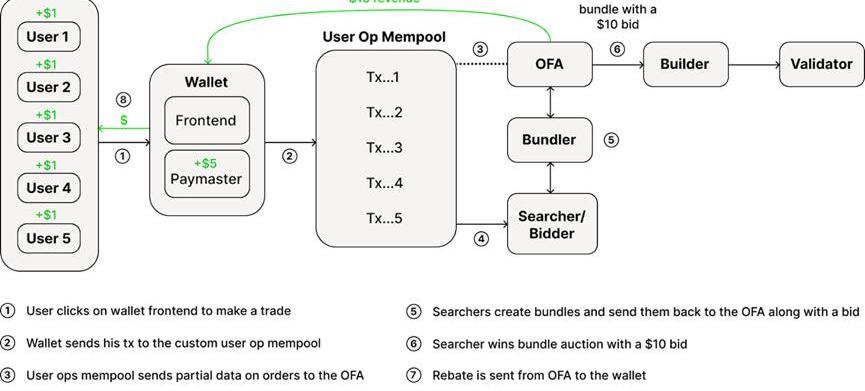 個人錢包和使用嵌入式錢包的應用程序可能希望建立自己的OFA,從用戶操作中獲取MEV,類似于Robinhood將其訂單流出售給做市商和大型交易公司的方式。同樣,個人錢包和使用嵌入式錢包的應用程序可以使用他們捕獲的MEV來補貼用戶的汽油費。