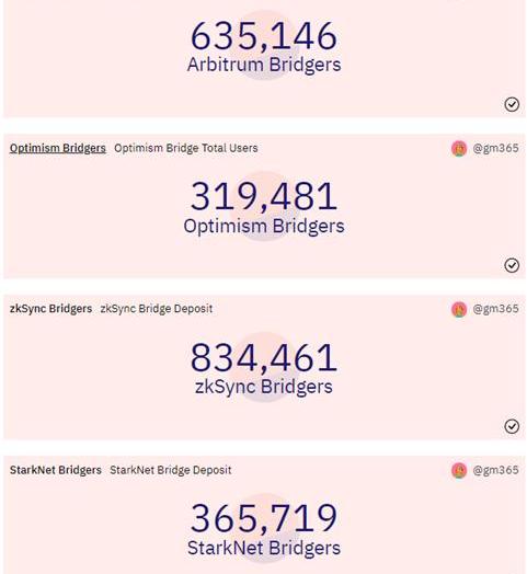 在市場表現上,相對比L2四大天王的其他三個,TVL有較大差距。橋接用戶量相對可以,從圖中也可以看到StarkNet橋接用戶量已突破36萬,橋接用戶量超過發行OP的Optimism。