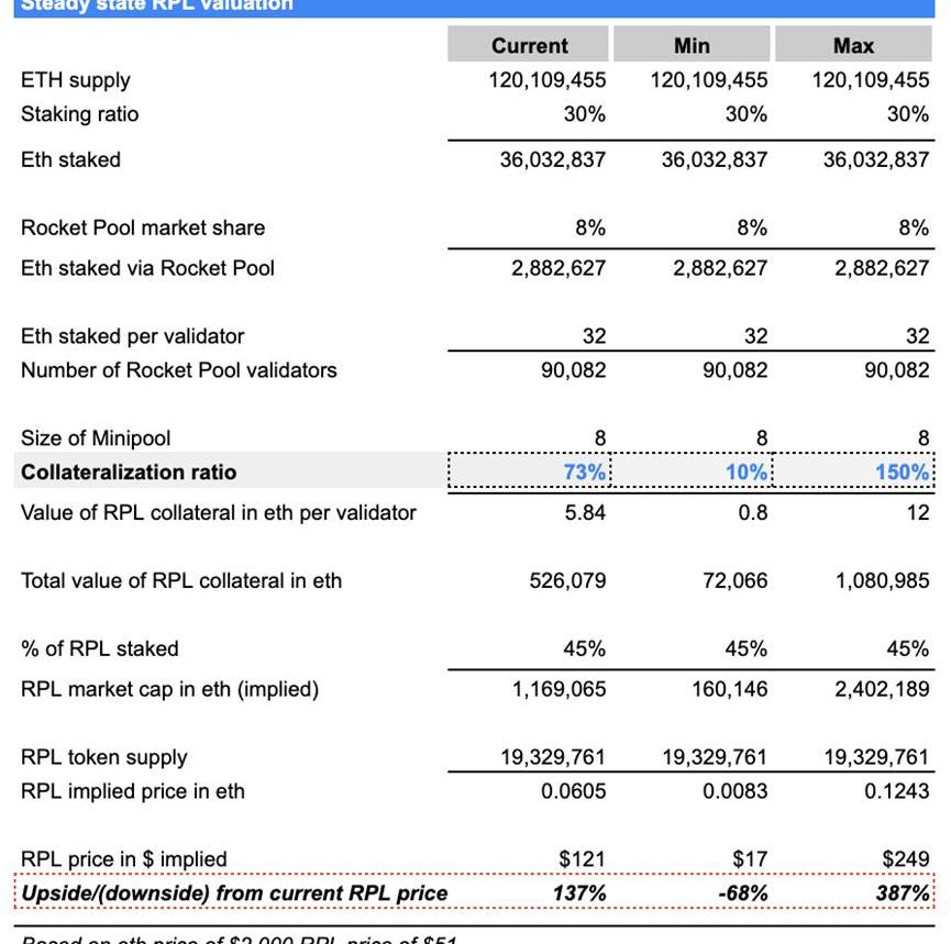 下表說明了除抵押率外所有變量不變的穩定狀態RPL估值。我使用與之前相同的30%的質押ETH和8%的RocketPool市場份額,但顯示了三種抵押情況。當前假設當前的抵押率為73%.最小假設為10%,最大假設為150%.請注意,基于不同的抵押假設,隱含的RPL價格大不相同。