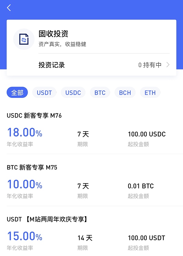 2)可以選擇M站兩周年專享:年化15%,14天期限,USDT幣種投資,限額10000USDT的固定收益保本理財產品。