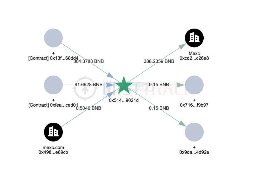 經過MistTrack團隊的調查,發現這些資金已經被兌換成了以太坊,并轉移到了幣安智能鏈,之后再次兌換成BNB,最后被轉移到了MEXC交易平臺,而項目的初始資金也來自于MEXC交易平臺。