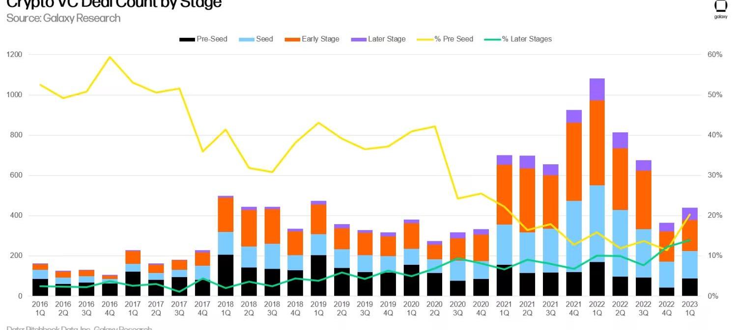種子前投資正在增加。在經歷了2022年慘淡的第四季度之后,種子前投資的數量在相對和絕對基礎上都在上升。在2023年第一季度完成的所有加密VC投資中,有20%流向了處于早期階段的公司,這表明創始人很活躍,VC也很關注。由于許多人在熊市期間完全退出了加密行業,精明的VC可能會像在之前的熊市期間那樣在充滿挑戰的環境中找到頑強的初創公司。