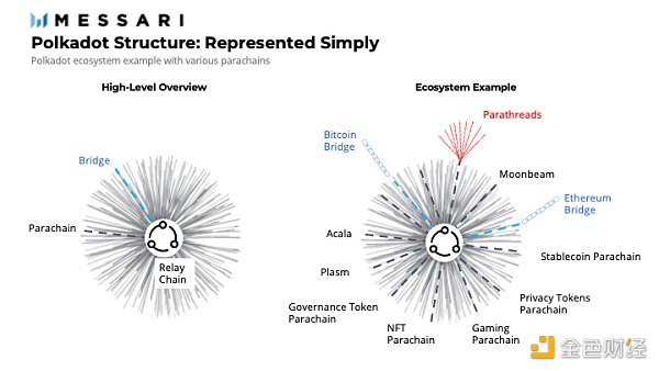 可以有100多種不同平行鏈鏈接到中繼鏈上。這些平行鏈大致分為兩類:layer1鏈和公共產品鏈。