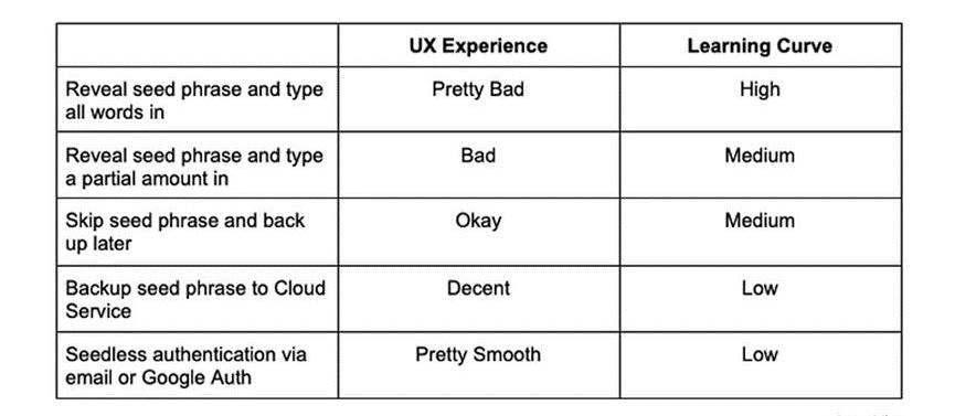 對于進入Web3領域的個人來說,這是最困難的部分。他們通常會始于一個歡迎屏幕,被程序問候,以保存和存儲一個24字的種子短語。這與用電子郵件注冊或用谷歌登錄的用戶行為非常不同。我見過一些護照有很好的上手引導,但也有一些護照犯了一個錯誤,就是假設用戶知道什么是種子短語。使用賬戶抽象和MPC基礎設施,這將有助于改善這一過程。更多內容請見下面的章節。