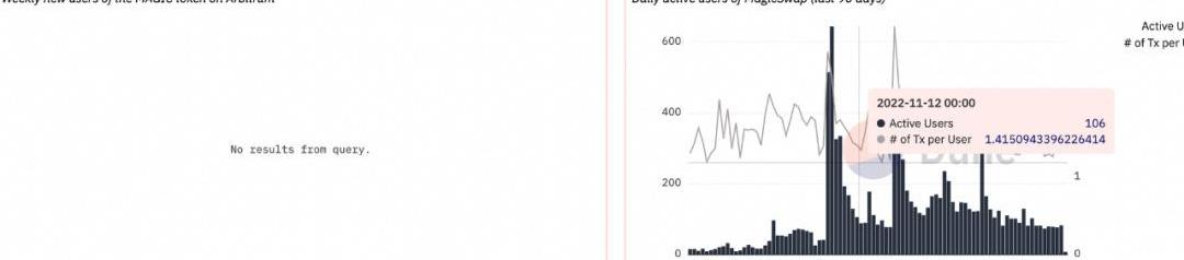根據官方在DuneAnylatics上的數據顯示,TreasureDAO推出之后,經歷了兩個時期的快速發展,第一階段于去年十二月份開始,活躍地址呈增長狀態,直到二月底三月的高峰期,達到兩三萬人的周活數據,之后隨著宏觀面的下降,于2022年8月份跌至兩三千人的水平。而本次由Beacon驅動的增長,再一次突破了前高,于十一月份達到47000的峰值。相較于活躍地址,Magic代幣的交易量自一二月份以來大幅度下滑,至今維持在每周幾十萬的水平。