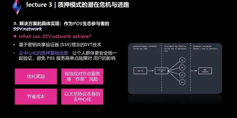 另外一個點就是質押模式的風險的解決方案。因為站在SSV的角度,我們希望把這個問題解決掉。如果私鑰不在自己手里,晚上會睡不著覺。而SSV解決的問題就是讓你的提款私鑰放在自己的手里。如果說你的私鑰不丟失,你的幣就不會丟失,這個就是核心的「don'ttrust,?justverify」。