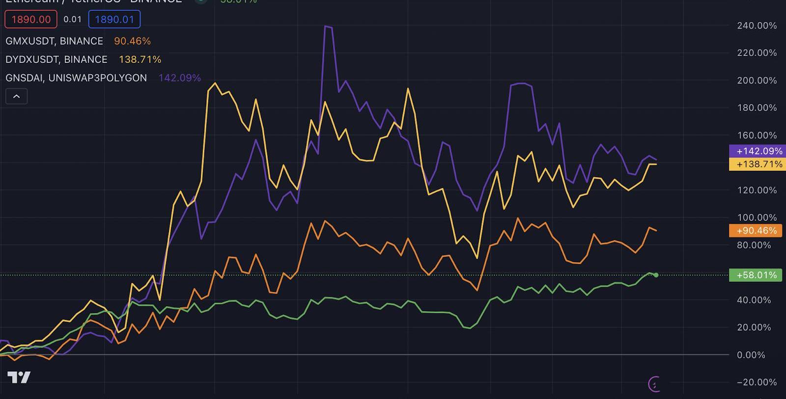 這種增長導致了許多優秀的永續合約協議治理代幣的表現優于ETH,例如dYdX、GMX、GainsNetwork和Kwenta等DEX。
