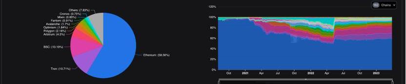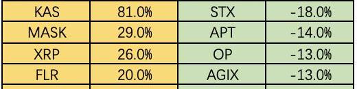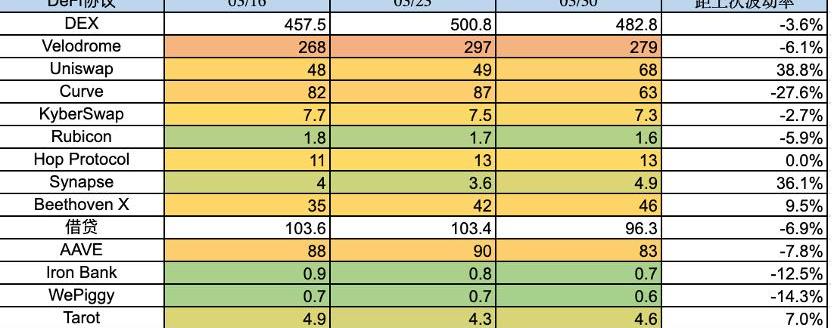連續兩周回升之后,本周TVL總量小幅下降,~0.5b。本周ETH鏈占比小幅下降,從上周的59.02%下降到58.56%,但從更長的時間線看eth生態的TVL在穩定上升。從近七日的數據看,除了Optimism下跌6.45%外,其他Ethereumlayer2的公鏈都在繼續上漲。Arbitrum保持良好的上漲趨勢,7.25%,Polygon上漲1.57%,、Avalanche上漲3.26%。