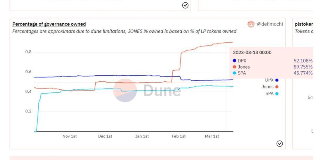 我還特別看好PlutusDAO,因為它被定位為Arbitrum的治理聚合器,我認為PlutusDAO要將plsRDNT納入其平臺也將是一個利好事件,PlutusDAO目前已經控制了JONES-WETH89%的流動性,以及52%的DPX代幣和45%的SPA代幣。
