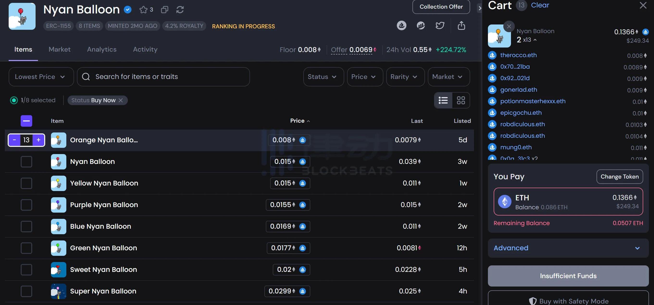 NyanBalloon有多種不同顏色的氣球。在OpenSeaPro上,用戶可以快速選定自己想要的氣球顏色,并且給定購買數量,一目了然
