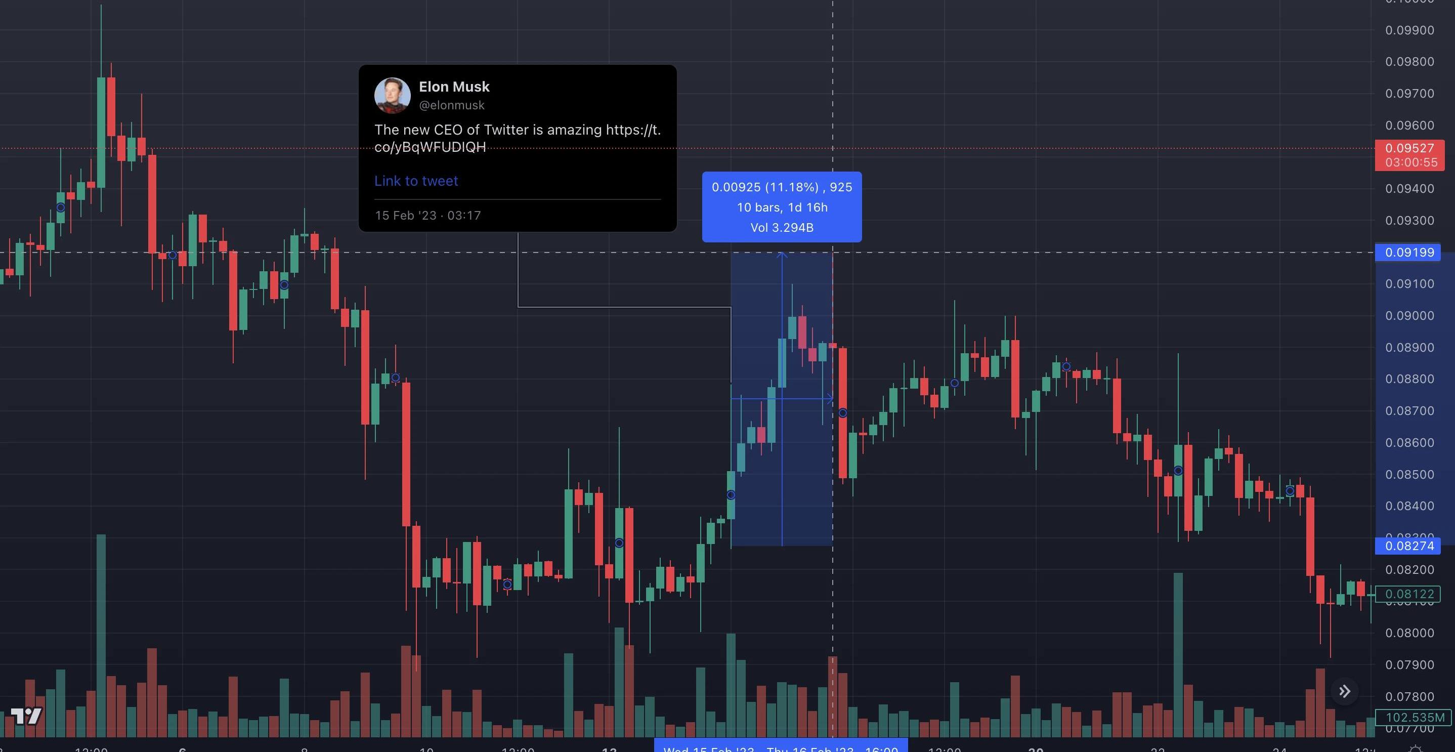 在推文發布的一個小時內,DOGE短時大漲約?6.3%?,最高觸達?0.0827?。在短暫的回調后,DOGE?繼續上漲,