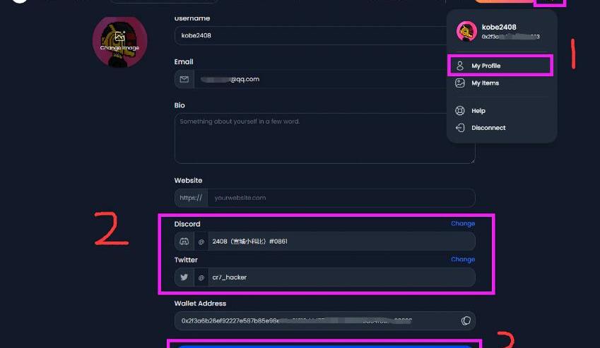 1:點擊頭像,選擇修改用戶資料2:完成基礎信息填寫,驗證discord和推特3:更新資料,保存