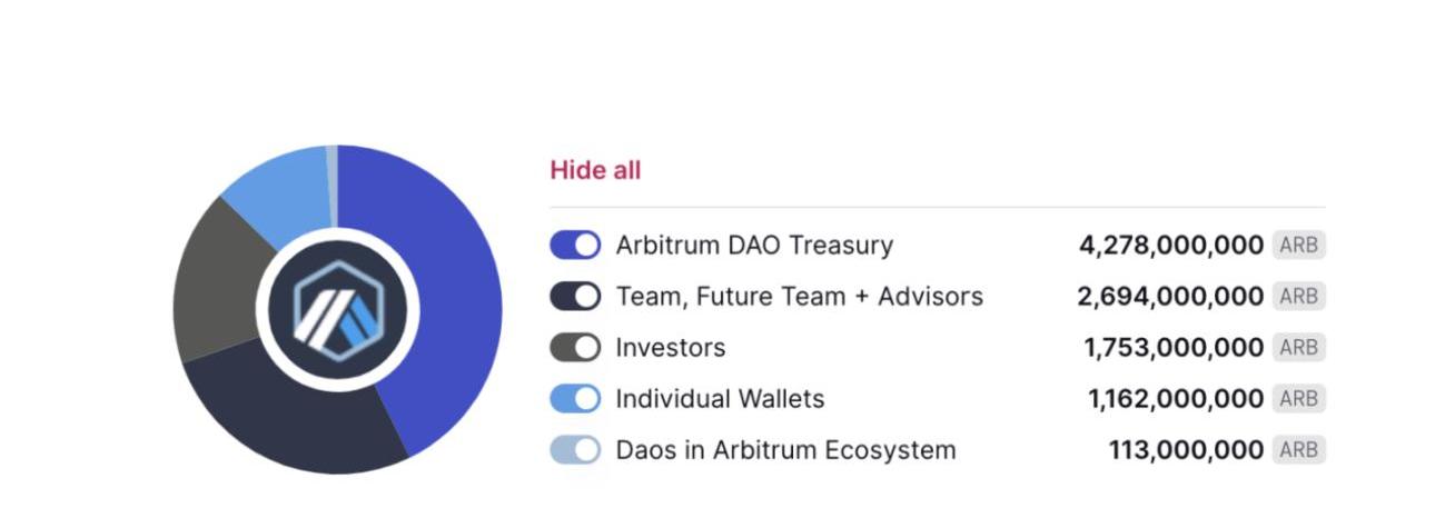 此外,后63個DAO均獲得7.5萬枚ARB代幣分發,共計472.5萬枚ARB。