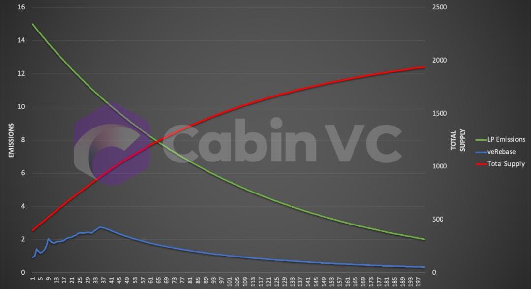 目前為第39周,正處于rebase拐點,當前rabaseAPR為15.69%。按照目前80%的鎖倉率估算,總供應量將在第200周達到2000M,目前為854M。
