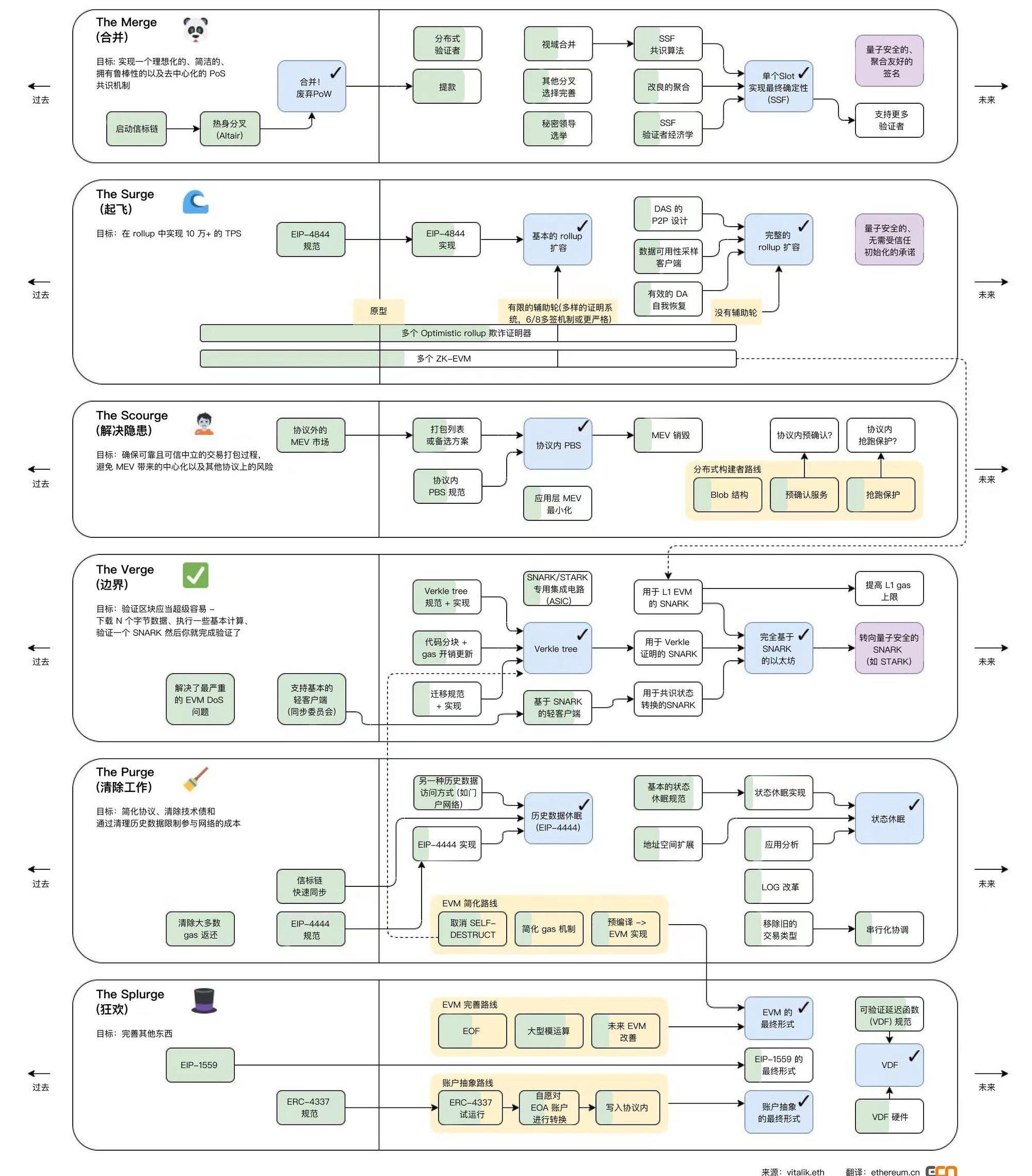 從2015年至今經過了漫長的討論和迭代后,最終以太坊在EIP-3074和EIP-4337這兩個方案之間進行抉擇,如果說EIP-4337是讓CA智能合約賬戶錢包可以像EOA那樣使用,那么EIP-3074就是讓EOA外部擁有賬戶錢包可以擁有智能合約賬戶的可編程功能,最終隨著以太坊創始人Vitalik公布的以太坊最新路線圖中,EIP-4337被正式納入在TheSplurge階段中實施,這也讓EIP-4337成為了賬戶抽象的最終方案。