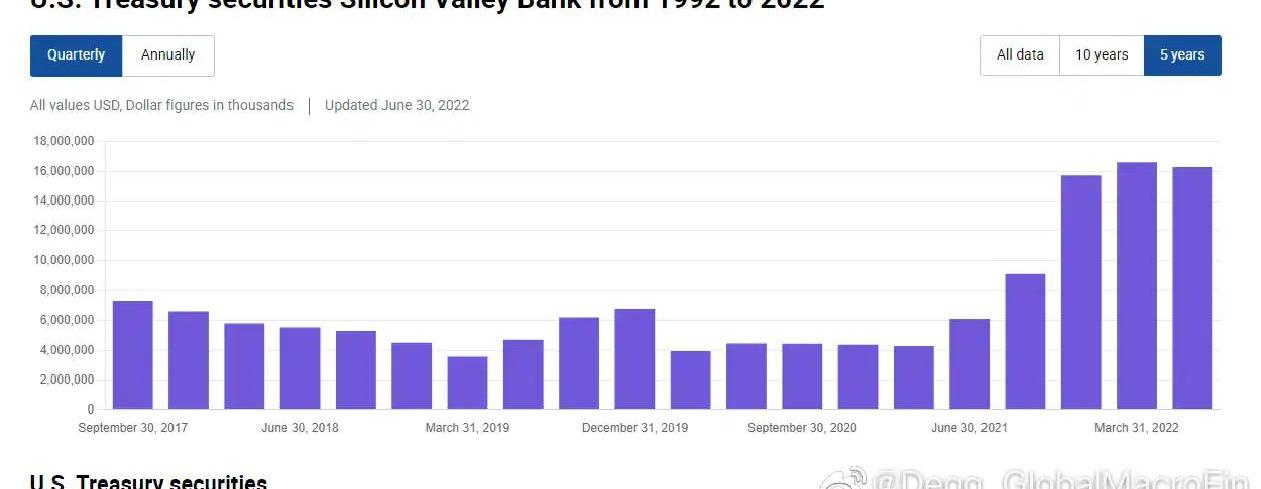 面對負債端資金的大量流入,SVB資產端可投資資金也快速上升。2020-2021年美聯儲還沒有開始加息,如果把錢趴在美聯儲的準備金賬戶上,年化只有低的可憐的0.1%的利息。SVB的選擇是,買大量的美債和MBS。從它的10-Q來看,2020年年中到2021年末,SVB增持了120億的美債,持有量從40億增長到了160億。更重要的是,SVB增持了大約800億美元的MBS,持有量從200多億增長到了1000億。這是什么概念呢?SVB總資產規模大約2000億美元,相當于它將一半的資產配置在了MBS上,或者認為它將2020-2021年新增流入的超過1100億存款中的70%配置在了MBS上。這對于一家以貸款為主營業務的商業銀行而言幾乎是難以置信的,甚至是荒唐的。