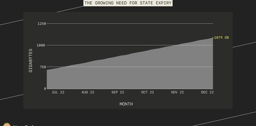 還有一個問題是對等網絡上的blob交易的實際八卦問題,因為這些blob的大小比目前正在八卦的東西大得多。這需要進一步研究,Paradigm目前正在探索。看到這一點,以及以太坊網絡是否能夠處理這種進一步的狀態膨脹和數據,將會很有趣。不管怎么說,狀態過期很可能需要限制以太坊狀態的增長——目前以太坊鏈全同步的狀態是1079GB,而且每天都在增長。狀態過期將通過狀態租賃來實現,因此將狀態出租給鏈外存儲,或者通過每月或每周移除狀態,然后存儲在檔案節點上。