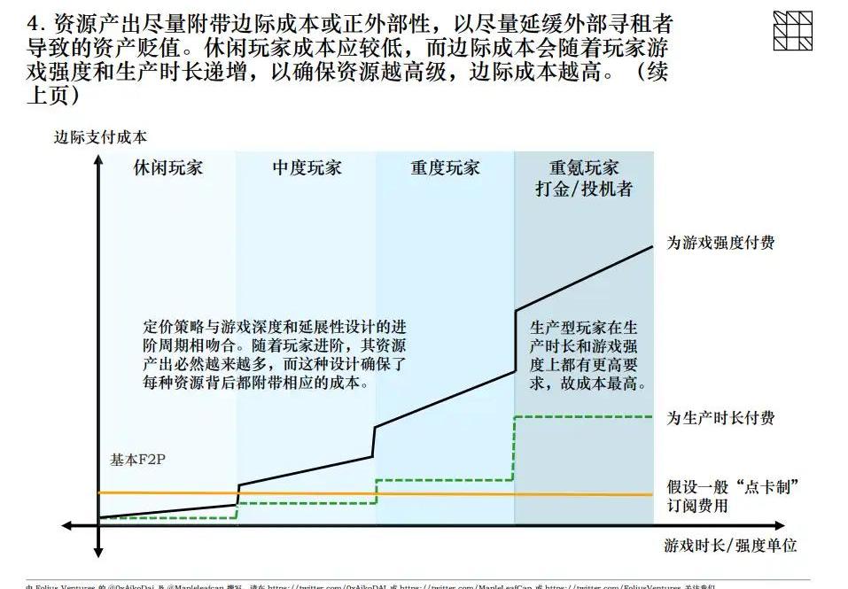 傳統游戲收費方式粗放,或誘導玩家無限為數值和效率付費。但在Web3抽稅制游戲中,應按照玩家游戲強度和生產時間進行階梯式定價,以確保休閑玩家低門檻進入,重度玩家為強度付費,而生產型玩家成本最高且復雜,以減少尋租行為導致的資源貶值。