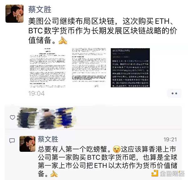 就在公告發布后不久,美圖公司董事長蔡文勝就在朋友圈發文表示,“美圖公司繼續布局區塊鏈,這次購買ETH、BTC數字貨幣作為長期發展區塊鏈戰略的價值儲備。總要有人第一個吃螃蟹。這應該算香港上市公司第一家購買BTC數字貨幣吧,也算是全球第一家上市公司把ETH以太坊作為貨幣價值儲備。”