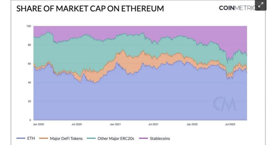 穩定幣市值在以太坊中的相對份額正在大幅增長。