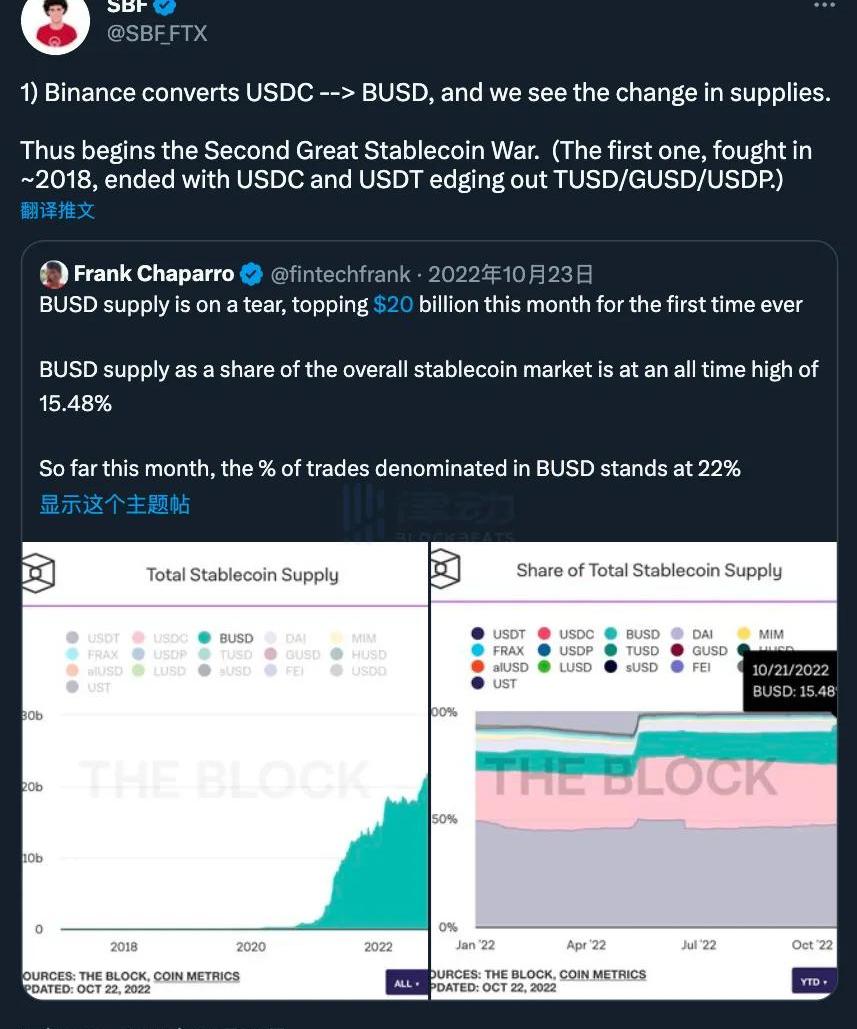 與此同時,BUSD交易量不顧市場低迷,一路不斷飆升,市場份額也達到15.48%的歷史最高水平,市值則觸及220億美元。看到BUSD的驚人數據后,還是FTXCEO的SBF發文回應:「Binance將USDC兌換為BUSD,隨后我們便看到其供應量的變化。第二次穩定幣大戰自此開始」。