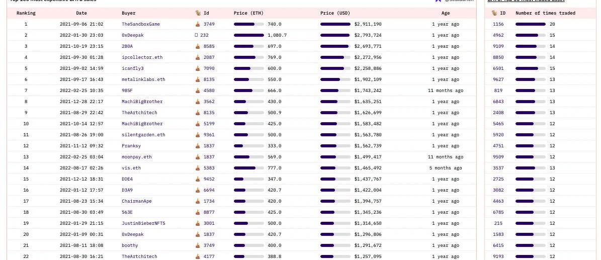 銷售排行榜上,前五名銷售額都超過200萬美元。其中,售價最高的BAYC藏品是#3749,一年多前被?TheSandbox?以近300萬美元的價格購買;排名第二的是#232?,由Chain?Protocol?首席執行官Deepak?Thapliyal購買,花費1080ETH——按照ETH計價是最高的BAYC。