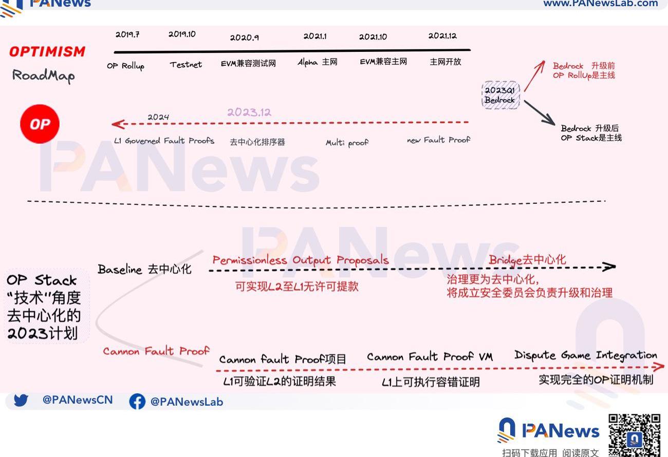 2023年,OPStack將主要集中在實現“基線”升級方案,2024年將會實現完整的容錯機制證明的去中心化。一旦實現,例如在主網上部署額外的證明系統、逐步淘汰現有證明者網絡、刪除升級密鑰以及去中心化排序器等主題將會依次實施。