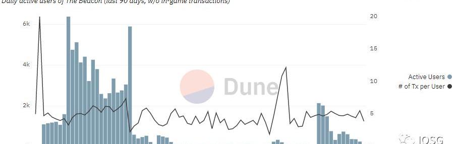 TheBeacon實際上是Treasureverse中的第一個具備可玩性的游戲。這是一款類rogue-like動作角色扮演游戲,為TreasureDAO贏得了很大的注意力。TheBeacon上線前,Treasure的最高周活躍用戶僅錄得不到1萬。而TheBeacon就有近3萬的總用戶,幾乎是之前Treasure用戶數量的3倍。不僅如此,TheBeacon還為Trove貢獻了超過600萬美元的交易量。