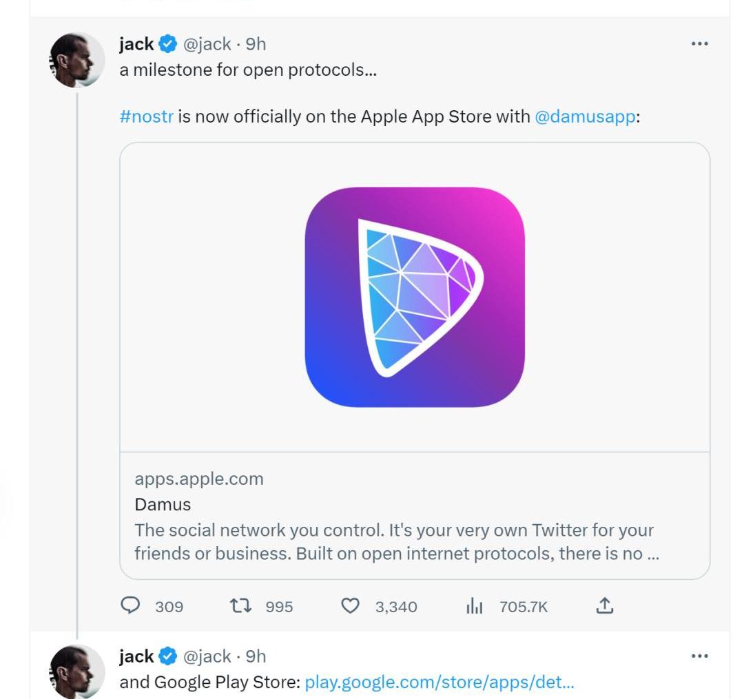 2022年底,前Twitter創始人杰克·多爾西為Nostr開源開發捐贈了14個比特幣。