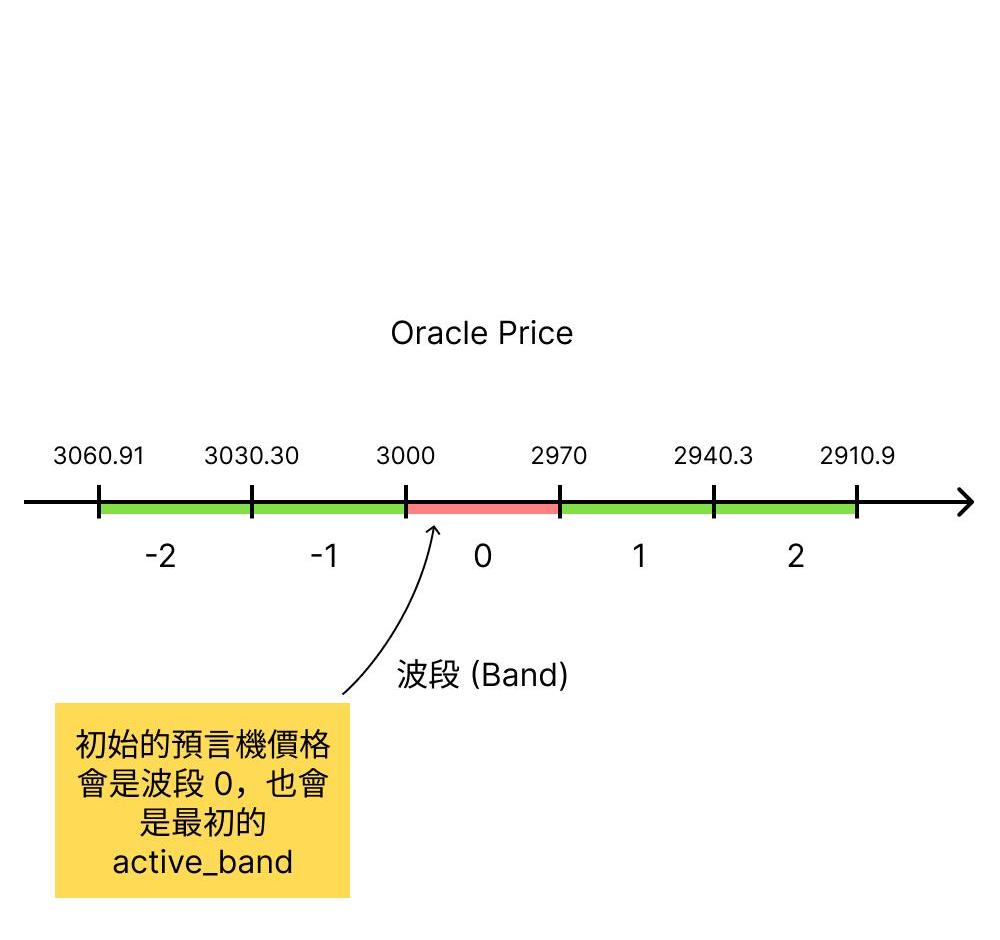 波段(band)?波段是當使用者把抵押品存入系統時,抵押品會被存入的區段,當預言機價格移動到這個區間時,使用者的抵押品就會開始被轉換成穩定幣。而剛開始建立AMM時會根據預言機的價格切分波段,其中預言機價格所在的波段會是波段0(band0),預言機價格越低,波段編號越高。