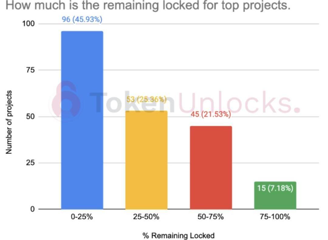 通過對Coingecko市值前300幣種的統計,盡管固定總供應量82.1%的代幣已經在市場上流通,但仍然有市值1020億美元的代幣將在2023年解鎖。