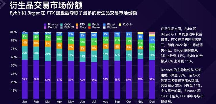 在衍生品方面,Bybit?和?Bitget?從FTX的崩潰中獲益最多。FTX在年初還排名第三,卻自2022年11月起消失不見。Bitget的份額從3%上升到11%,Bybit的份額從8%上升到11%。