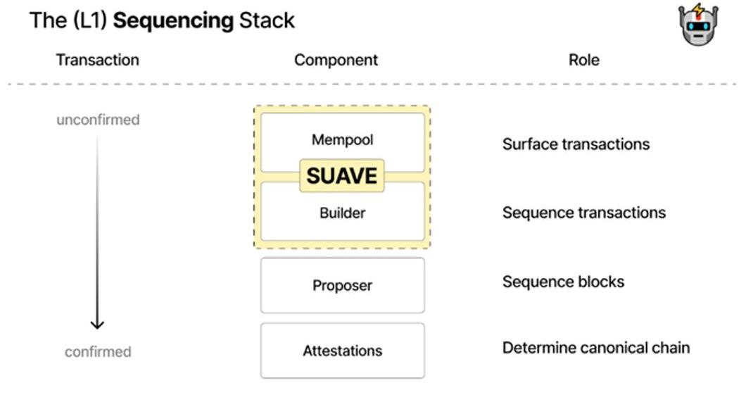 SUAVE是一個獨立的區塊鏈,但可以理解成是一個可以插在任何其他鏈的插件,充當其他鏈的Mempool和builder。SUAVE把所有鏈的Mempool和builder與其他角色分開,實現專業化管理,以此提升全鏈效率。SUAVE實現了共贏,即區塊鏈本身更去中心化,validator收入最大化,searcher/builder能夠設置偏好且潛在收入變大,用戶也能用最便宜的價格進行私密交易。