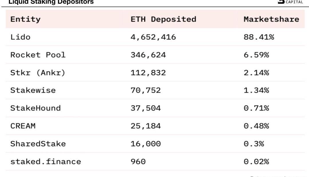 在LSD協議版塊,目前可統計的有Lido、RocketPool、Stkr(Ankr)、Stakewise、StakeHound、Cream、SharedStake、StakedFinance和FraxFinance等9個項目。Lido憑一己之力拿下了465W枚ETH代幣,占LSD版塊市場份額的88.41%,占整個信標鏈質押市場份額的29%,超越了所有CEX質押ETH數量的總和。