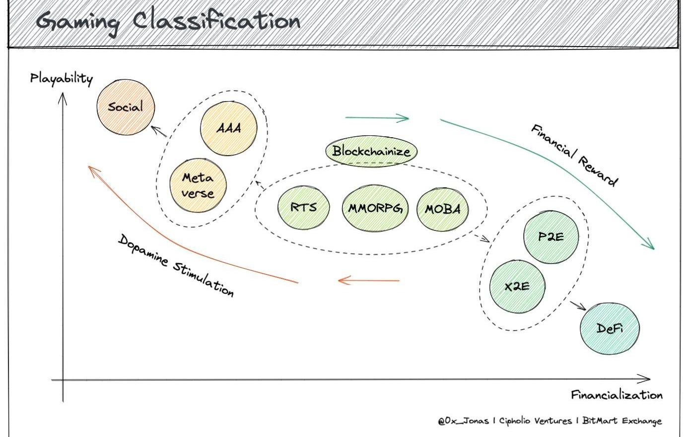 因此,我們可以看到,區塊鏈游戲正站在選擇擁抱金融化成為提供純數學游戲的平臺,還是專注于游戲內容成為下一代社交平臺入口的十字路口。AAA/Metaverse和P2E/X2E都只是當前范式轉換的中間產物,只是過程和手段,而不是結果。沿著區塊鏈游戲最終會沿著社交和DeFi兩個場景落地的思路,我們認為這個垂直領域會有一些值得關注的機會。
